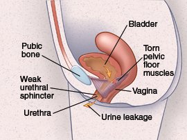 The pelvic floor muscles and connective tissue may stretch, weaken, or tear. Weak or torn structures can’t support the urethra and bladder. The urethral sphincter may also weaken. These changes can cause urine to leak. The changes may be caused by: